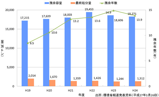 最終処分場の残余容量は、平成25年4月1日現在で、約18,271万立方メートルとなっています。平成24年度の最終処分量及び平成25年4月1日現在の最終処分場の残存容量から最終処分場の残余年数を推計すると、全国では13.9年です。